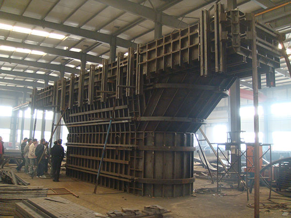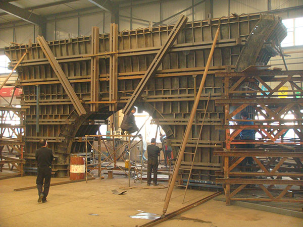 在鐵路工程中,圓端墩柱是最常見的墩型,包含雙曲墩、帶牛腿墩柱(天方地圓/上圓下圓)、空心墩等,模板一般采用拉桿或桁架形式加固,根據(jù)力學模型計算結(jié)果確定模板材料。墩柱模板生產(chǎn)工藝不同于普通組合鋼模板定型,墩柱模板一般都是由施工單位提供構(gòu)件設(shè)計圖紙,模板設(shè)計人員根據(jù)藍圖結(jié)合施工單位意見量身定做而成,既區(qū)別于普通的精細機加工產(chǎn)品,又區(qū)別于建筑鋼結(jié)構(gòu)。