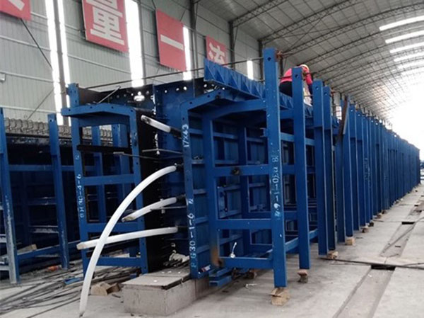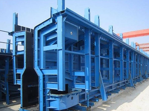 T梁模板由側(cè)模、端模、底模等組成,除底模一般采用混凝土臺(tái)座外其余均采用鋼模板。T梁模板加工時(shí),采用整體拼裝焊接工藝,拼縫嚴(yán)密、無錯(cuò)臺(tái),很好的保證整體尺寸。為了保證模板順利拆模,T梁橫隔板模板按照上大下小,內(nèi)大外小的原則設(shè)置脫模斜度;